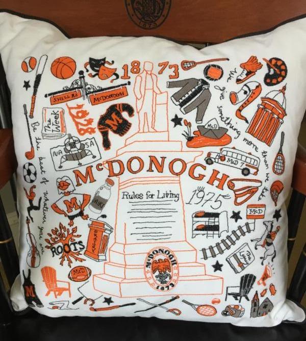 PILLOWS STUFFED WITH TRADITION  Looking for the perfect gift for someone who "bleeds" orange and black? Purchase this one-of-a-kind McDonogh pillow full of images that evoke McDonogh traditions - from the cavalry and The Week to boarding, coeducation, and the McDonogh seal. The pillows measure 16"x16" and cost $150. They are down-filled with a 10% linen/90% white cotton cover that may be removed for cleaning. Please note: the pillows are not available in the school store. To purchase your pillow, contact Jen Little, Associate Head of Advancement for Alumni Relations, at jlittle@mcdonogh.org. |