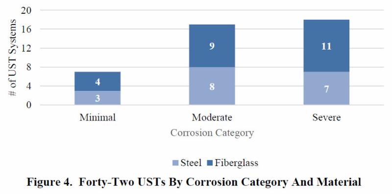 "EPA conducted on-site inspections of 42 diverse, operating UST systems at 40 sites across the country. Of these UST systems, 24 had fiberglass tanks, and 18 had steel tanks. The major finding from our research is that moderate or severe corrosion on metal components in UST systems storing diesel fuel in the United States could be a very common occurrence. Observations suggest that corrosion may be commonly severe on metal surfaces in the upper vapor space of UST systems, an area that before 2007 was not known to be prone to corrosion."