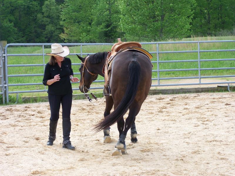 The fourth body part of the horse is the rib cage. If the head of the horse is brain central, then the rib cage of the horse is balance central. A rider's balance should be in direct alignment with the horse's rib cage. Both horse and rider learn to balance best when working on the circle rather than a straight line. Circles are nothing more than straight lines on a curve! When on the circle, a rider's inside leg should lay close to the center of the horse's rib cage, and one's outside leg should move slightly either forward or backward as needed to direct or pressure the hindquarters to keep on a circular track. As a rider, if you do not make a connection via pressure with the horse's rib cage along with correct leg cues, then your horse will be out of balance.