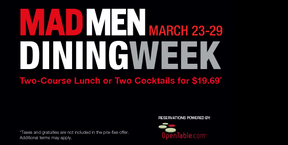 March 28 NYC Craft Distillers Festival The Bowery Hotel (335 Bowery) Sample of 60 specially selected spirits while a 1920s style jazz band keeps the party lively. Through March 29 "Mad Men" Dining Week Mad Men Restaurant week at $19.69 prices! Even the 21 Club and Le Cirque will take part in this once in a lifetime tribute to the finale of a stellar series. Visit the website for participating restaurants.