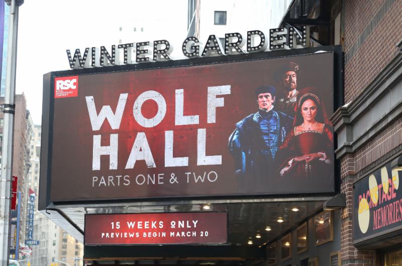 Wolf Hall Through July 5 Winter Garden Theatre (1634 Broadway) Parts 1 and 2 ... 2 major plays, 1 royal event. Performed in repertory, Hilary Mantel's exhilarating stories of power and persuasion in Tudor England will transport you to the volatile court of King Henry VIII.