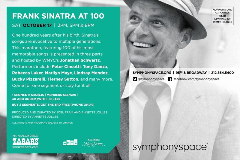 October 17 Frank Sinatra at 100Peter Jay Sharp Theatre at Symphony Space (155 West 65th Street) A concert celebrating 100 of Sinatra's hits. October 18 TalkCinemaThe Walter Reade Theater at Lincoln Center (165 West 65th Street) General admission or season passes available for the film series featuring new independent films... you won't know what you see until you arrive, but you'll be able to discuss the movie afterwards with directors, producers, distributors, critics and each other. October 19 through 24 New York Television FestivalVarious Locations Screenings of creative shows, educational panels, competitions, pitches, fan events, parties, premieres, and seminars encompass this festival. October 20 Colin Quinn The New York StoryCherry Lane Theatre (38 Commerce Street)