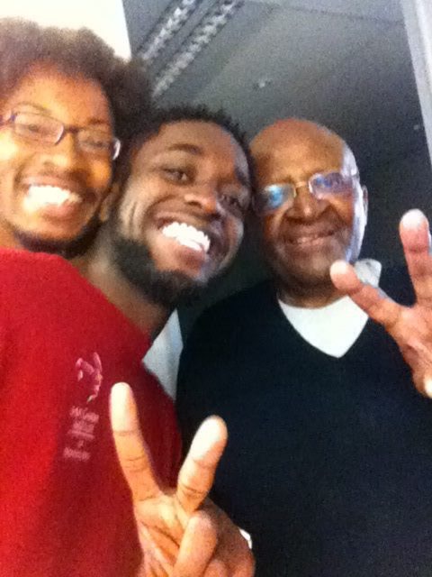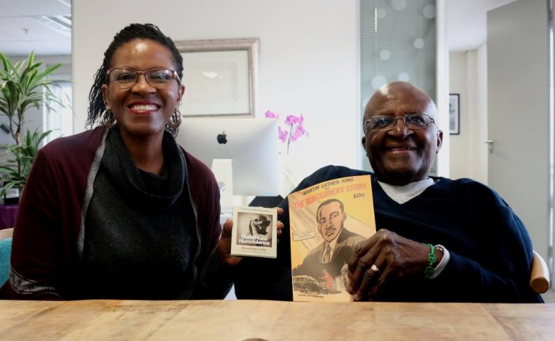 Mpho & Desmond Tutu with a Gandhi Knowledge Deck & Martin Luther King comic book.