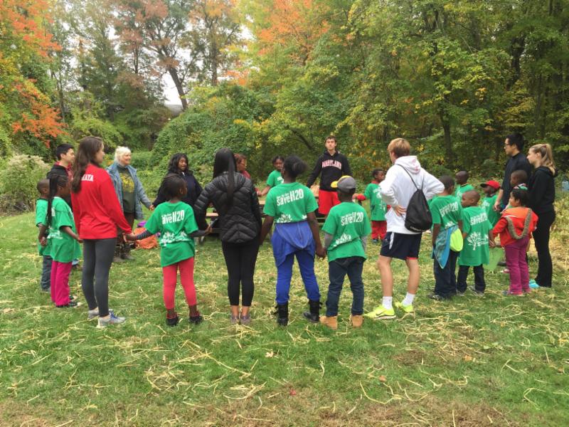 CHEARS Earth Squad and University of Maryland volunteers on fall 2015 workday in the Greenbelt Food Forest .