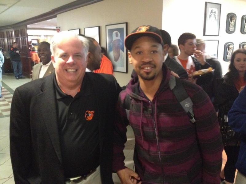 Sean Bridges receives employment supports at Total Wine and More, and he loves his job. He also enjoys getting around Baltimore and he's always going to interesting places and events. Most recently, Sean was at Camden Yards for opening day and who should he bump into and ask for a photo op -- Governor Hogan himself.