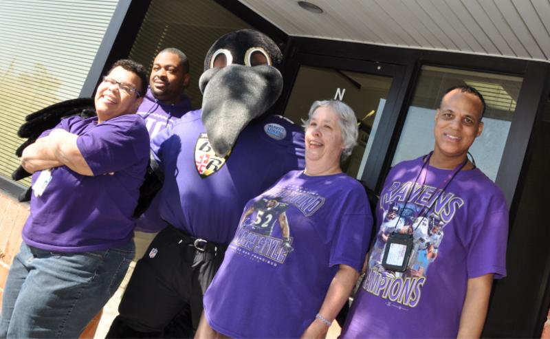 The Arc Baltimore center in Woodlawn received a visit on Wednesday from Poe, one of the Baltimore Ravens mascot. Staff and individuals we support had a great time posing for pictures and dancing with Poe.