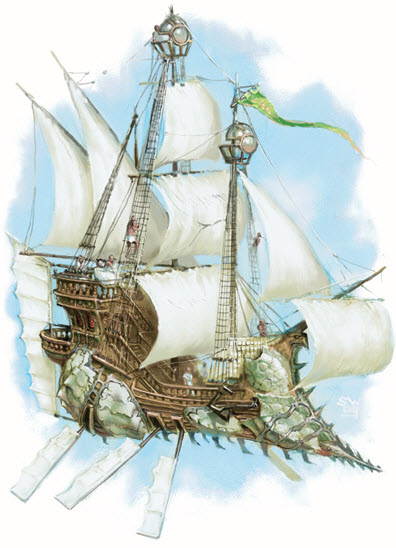 The flying vessel looked much like a normal seagoing sailing ship. Typicaly they had three masts, square sails, and a broad flat beam. Giant sea turtle shells were often used as armor.