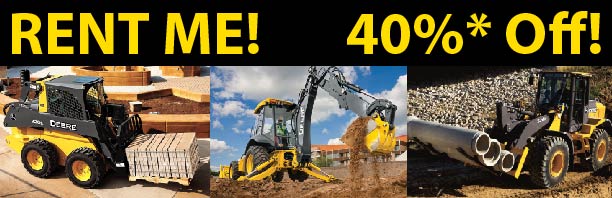 *40% Off Advertised Rate for all John Deere Skid steer models, John Deere 310SK/SL Backhoe models, and John Deere 524K, 544K and 624K Loader models Only. Subject to availability. Rentals must be at least 4-weeks or more in length and hours per month cannot exceed 100 hours or additional charges will apply. See dealer for full details. Offer subject to change or cancel at any time.