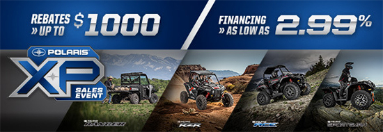 XP Sales Event! Rebates up to $1,000* + Financing as low as 2.99%** ATV Only: Free 5 Year Extended Warranty on Sportsman 570 & Sportsman ETX*** ACE Only: Up to $500 Rebate on Polaris ACE*