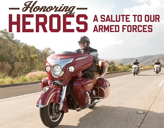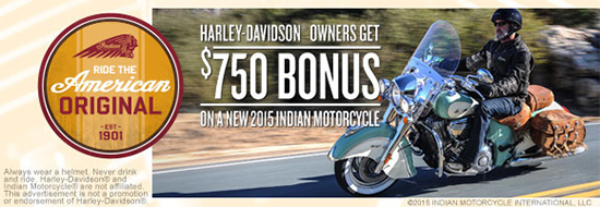 | | Indian Motorcycle honors armed forces with an additional $1,000 cash back on the purchase of any cruiser, bagger, or touring bike OR $500 in apparel or accessories with 2015 Scout purchase. |