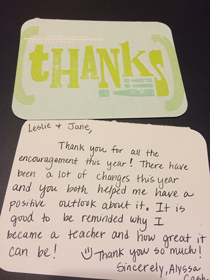 Thank you for all the encouragement this year. There have been a lot of changes this year and you both have helped me have a positive outloook about it. It is good to be reminded why I became a teacher and how great it can be. Thank you so much!