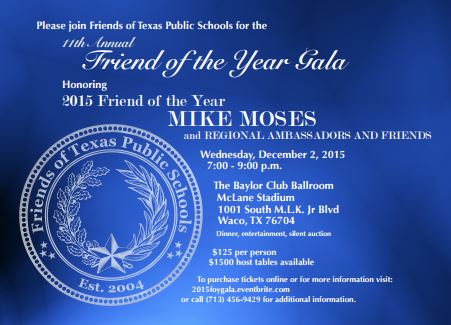 Tickets are available for the 11th Annual Friend of the Year Gala, scheduled for Wednesday, December 2 at McLane Stadium at Baylor University in Waco. Former Commissioner of Education, Dr. Mike Moses will be presented with the 2015 Friend of the Year Award, and the evening's activities will also include dinner, entertainment, and a silent auction. Individual tickets and host table sponsorships are available online at fotpsgala2015.eventbrite.com.