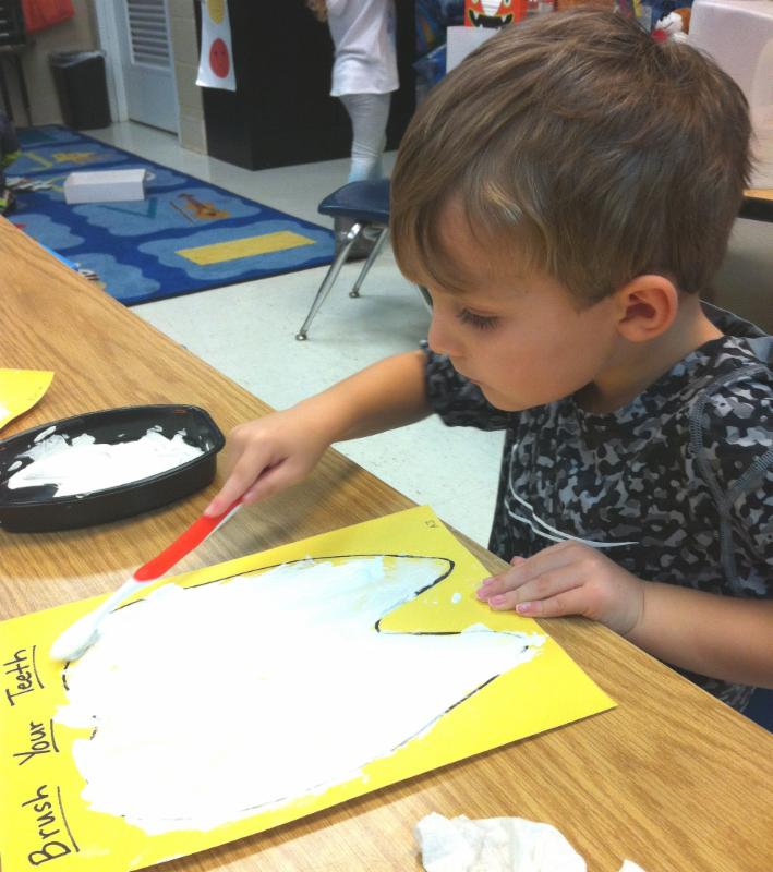 Shannon Beginnings Age 4 student AJ Dukes "brushed his teeth" during a recent shaving cream fun day!