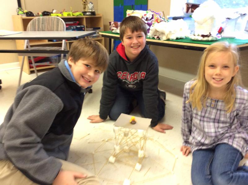 4th Grade students Samuel Norman, Zander Wilk, and Emily Long worked together to build a tall structure strong enough to hold a toy duck in a recent STEM Lab.