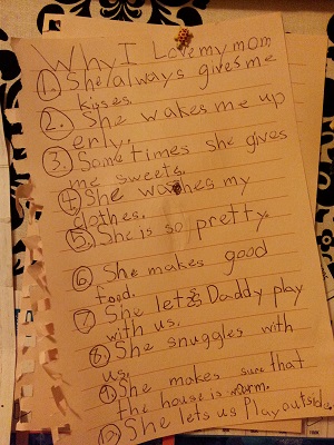 A few weeks ago I found this gem lying on the kitchen table when I came down to start my morning French Press-my 7-year-old daughter's list of why she loves me! continue reading