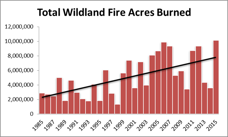 | | Figure 1. Total wildland fire acres burned by year in the United States for the period of 1985 to 2015. (Source: National Interagency Fire Center) |