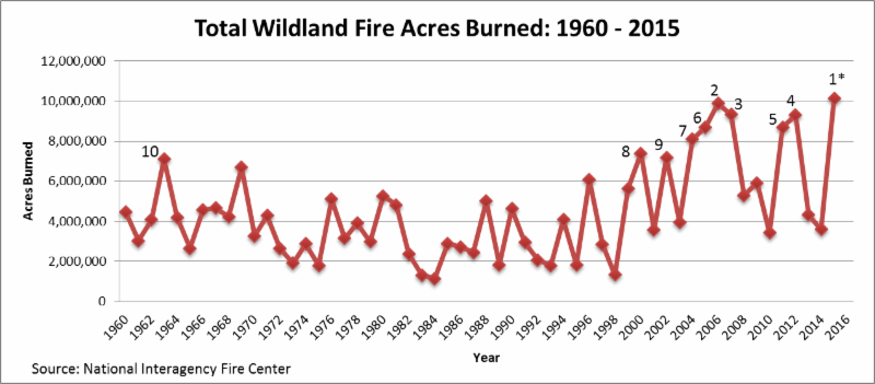 | | Figure 2. Total wildland fire acres burned by year in the United States for the period of 1960 to 2015. *Numerals reflect ranked order of values in terms of total acres burned by year. (Source: National Interagency Fire Center) |