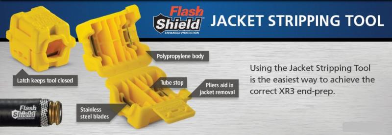 With the Jacket Stripping Tool you can quickly, and correctly, remove the protective jacket layers before connecting an XR3™ fitting. Proper removal of the outer jacket layer on FlashShield™ CSST enhances the electrical continuity of the system when used with the XR3™ fitting. The Jacket Stripping Tool replaces your utility knife by taking the guesswork out of counting corrugations and cutting down to the correct depth.