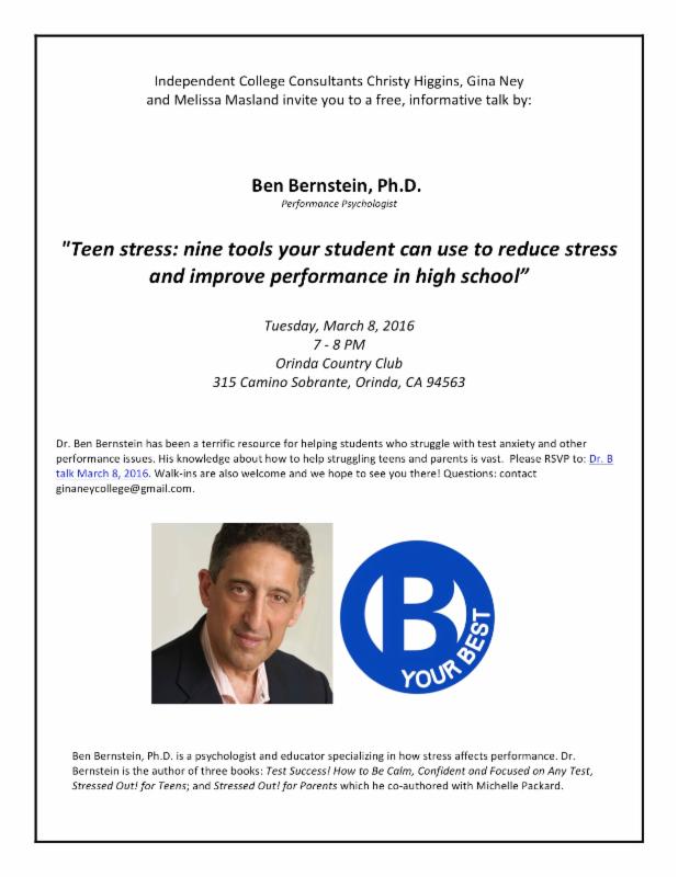 Independent counselors Christy Higgins, Gina Ney, and Melissa Masland, invite Lamorinda parents of teens to attend a free, informative talk by Ben Bernstein, PhD: "Teen stress: nine tools your student can use to reduce stress and improve performance in high school".