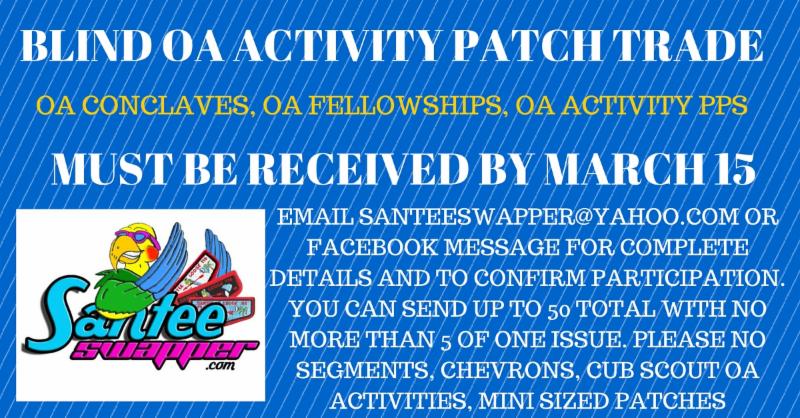 Do you have a bunch of stale OA activity patch inventory that you need to turn over and shake up? Things like OA conclaves, fellowships and OA activity patches? Today I'm launching an OA activity patch blind trade whereby you can send in up to 50 patches (no more than 5 of any patch) and get back the same number different. The minimum to get in is 10 patches. Send me an email if you want more information!