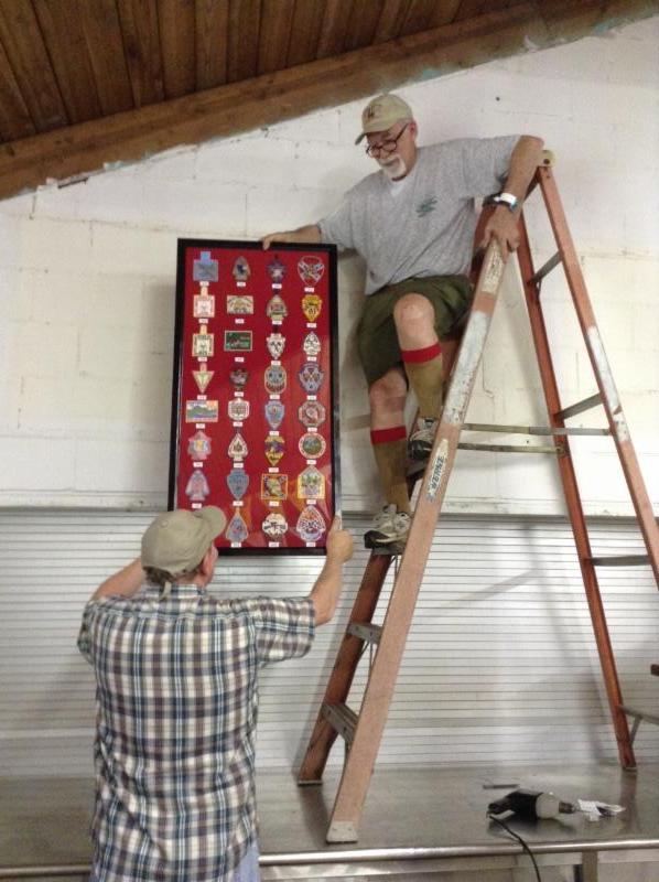 Here is a picture I snapped of the project this past weekend to return some beloved patches to the wall of the dining hall at camp. The old frames were in bad shape and since they were done over three generations did not match. Charles Galloway (pictured here) did all the work of putting the new frames together. I helped by providing the actual frames, filling in the patches we needed and splitting the cost.