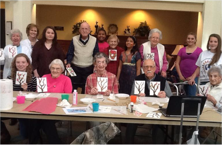 |  Students from the CAMS' North Multicultural Club taught some of the Menno Haven residents how to make Japanese cherry blossom trees. They also taught the residents about the annual Hindu spring festival called Holi, or the 'Festival of Colors'. |