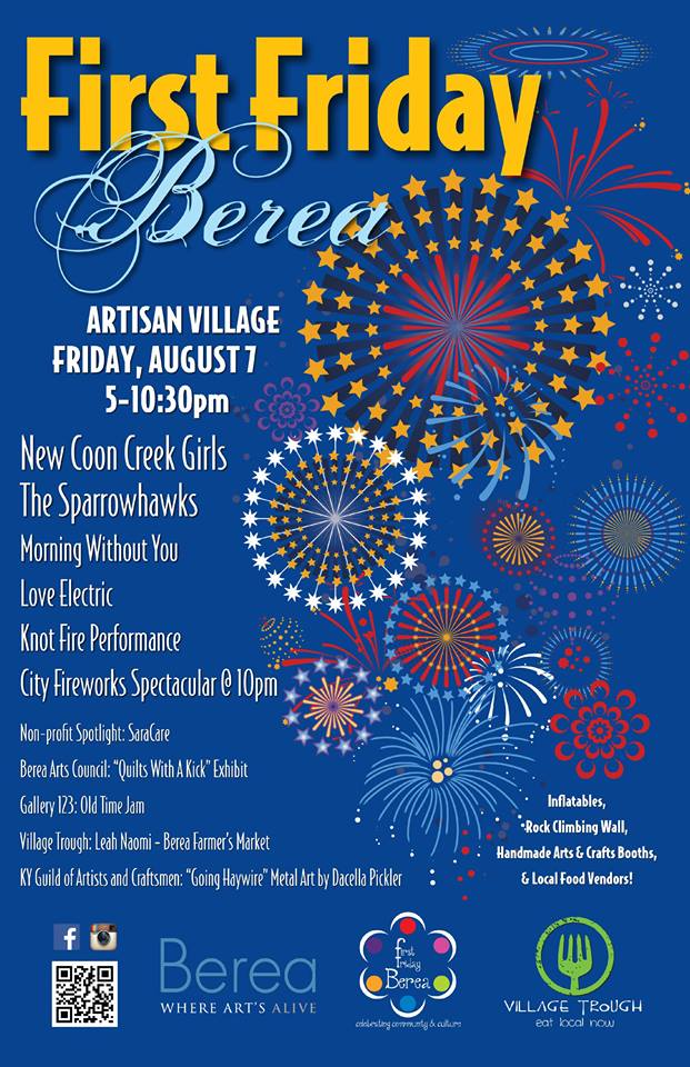 On Friday, August 7th, the City of Berea will have the fireworks display that was cancelled on July 3rd due to inclement weather. This will be in collaboration with the First Friday Event held in the Old Town Artisan Village. In addition to the activities at First Friday, there will be a climbing wall and inflatables for kids in the Old Town Artisan Village. FIREWORKS will be shot off from the same location as always (City Park) and they will begin at 9:45pm. PLEASE BRING BLANKETS &/OR LAWN CHAIRS!!!