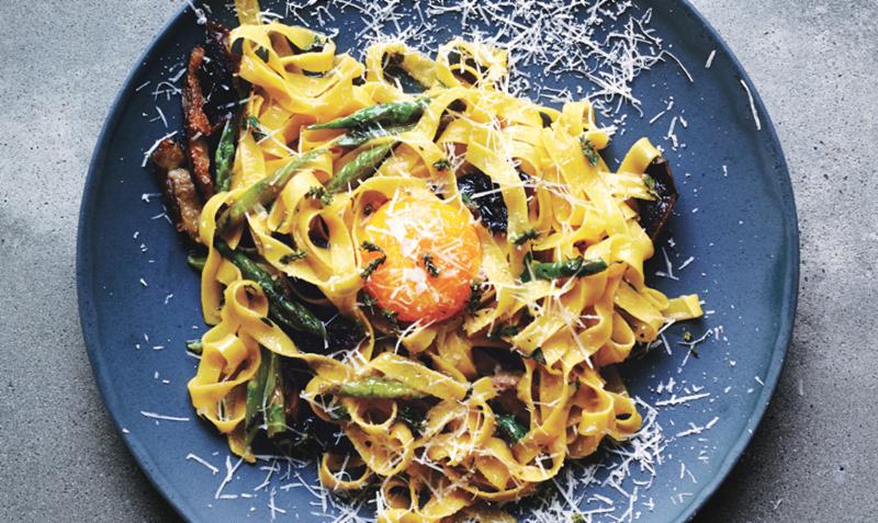 | For this seasonal (and vegetarian) twist on carbonara, stir the yolk into your portion while the pasta is still steaming hot.