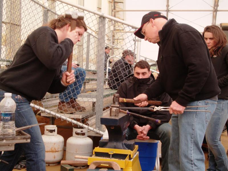 Tim McPhee, CJF, and Tim Bolduc, CF, assisted by Tyler Marshal, were the stars of the show, demonstrating forging techniques needed for the upcoming contest that we will put on at Mhyre Equine Clinic in Rochester, New Hampshire on May 2, 2015. We are fortunate to have such willing talent to help right here in this area. Tim McPhee is on the AFA team for the second time, Tim Bolduc made the cut at the convention, but not having finished the written portion of the CJF, is not on the team. Tyler Marshal is an artist as well as being very accomplished in the forge.