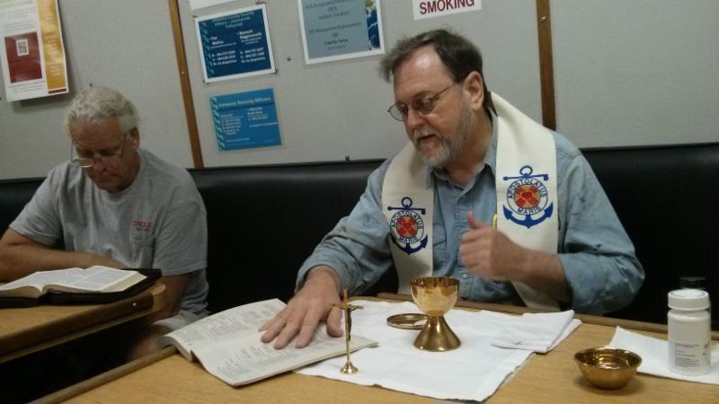 While at sea on the first Sunday, he said Mass in his room. But last Sunday some of the other crewmembers asked if they could attend Mass with him though they were not Catholic. Chief Mate, Joseph Spicciani took this photo of Fr. Sinclair celebrating Mass, while Capt. Gregg Wolffis who is Baptist, reads from his Bible.