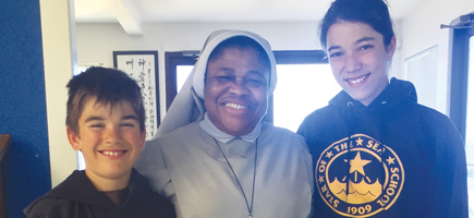 Holy Child Sister Joanna Okereke pictured with her are students Michael and Marina Belfiore, great-grandchildren of an Italian immigrant fisherman who made his living for many years fishing out of San Francisco.