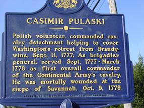 In 1760, on his fifteenth birthday, Casimir Pulaski's father told him to saddle up and go with him to fight the Russians and the Prussians. Born 1745, Casimir Pulaski had only 34 years to help reorganize the world. 1776 found Pulaski outlawed by Russia and Prussia so he took off for Paris where Ben Franklin talked him into supporting the colonies against England. In 1777, he arrived in Philadelphia, eager for revolutionary action with General George Washington. His tactics were so effective at the Battle of Brandywine on Sept 11, 1777 that Congress appointed him Brigadier-General in charge of Four Horse Brigades. Washington was so impressed with Pulaski that he had Congress put him at the head of the American cavalry and he became the "Father of American Cavalry". Pulaski was a wealthy Polish noble man. He used his own money to equip and feed the troops. On to Little Egg Harbor! Then south to Charlestown, SC. On October 9, 1779, Pulaski was shot off his horse by cannon fire and died three days later on October 15, 1779, age 34.