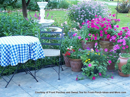 Flowers and porches go togetherwhen decorating for summer. This is another great way to add color and pizazz to your porch this summer. Color coordinate your flower's colors with your porch furniture, cushions, or other accent pieces to "pull it all together" when decorating. For summer fun, don't forget the flower pots.