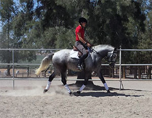 To get him going under saddle with a rider, Connor was lunged with a saddle. Within three days of being ridden for the first time, he was walking, trotting and cantering in the round pen. Within one ride he was responding to leg aids.