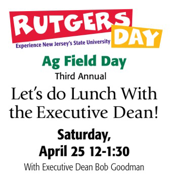 Soon it will be spring (no kidding!), which means that Ag Field Day and Rutgers Day won't be far behind. To celebrate, Executive Dean Bob Goodman invites alumni and their families to the Third Annual "Let's Do Lunch with the Executive Dean" on Saturday, April 25, 2015, from noon to 1:30 p.m. This popular "garden party" will take place under a festive tent on the lawn of Jameson Quad, adjacent to the charming Cooper Dining Hall. (In case of bad weather, we'll move inside Cooper.) All alumni from the School of Environmental and Biological Sciences and its predecessors are welcome, along with their spouses/partners and children. Also invited are retired faculty and their families. Traditional barbecue fare and beverages will be served. Come to catch up with friends and favorite faculty, to meet some of our students, and to enjoy some great food and fun. Register today.