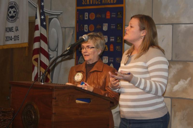 Five Exchangites who were not present at our last business meeting were presented Awards for lengthy years of service by National Exchange. Pictured here are John Youmans, Stephen Patton, Steve Cox, Tim Pape, and Dr Richard Dixon. Exchangite Hal Gosnell who is Chair of the Rome Toys for Tots campaign outlined the remaining steps needed to be accomplished in order for us to have a successful TFT campaign. Exchangites Barbara Carter and Meredith Brown outlined plans for this years scrapbook. The duo explained they are also asking Exchangites to save bottle tops from Coke products and the end package panels from Coke can products. There will be a basket in the lobby of the Palladium to deposit them and they will be exchanged for on-line services in producing the scrapbook.