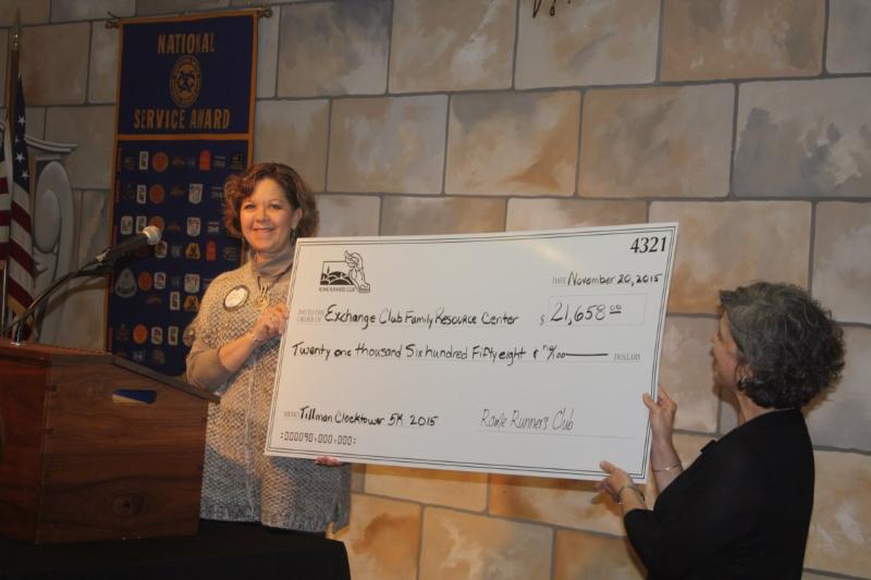 Exchangite Gail Johnson, who served as Race Director for the Gary Tillman Clocktower Race presented a check FRC Executive Director Tina Bartleson. The check shows the total amount of money the race brought to the Family Resource Center,$21,658!!!