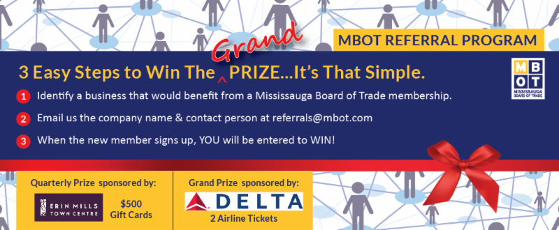 The quarterly prize of $500 gift cards will be announced at our monthly breakfast networking event (Good Morning Mississauga) in June and September. The grand prize of 2 Delta airline tickets will be at our Annual General Meeting in December 2016. You will also receive a free networking voucher for every single referral!