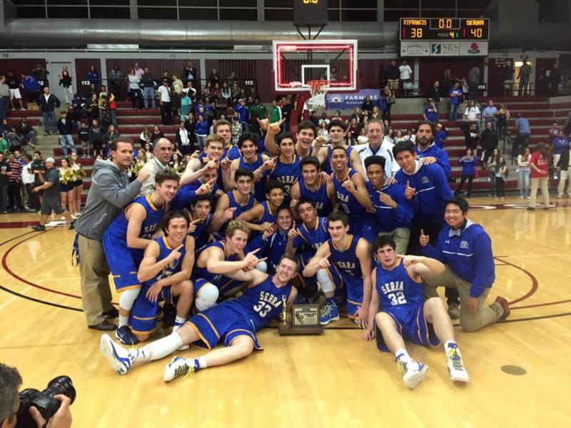 The Serra varsity basketball team defeated the St. Francis Lancers 40-38 last Friday night at Santa Clara in the CCS Open Division Championship. With just 0.6 seconds left in the game, j unior guard Jake Killingsworth made all three free throw shots, ending the game at 40-38. Congratulations to Coach Chuck Rapp '86, Coach Brian Carson and Coach Sean Dugoni '89 on an outstanding season!