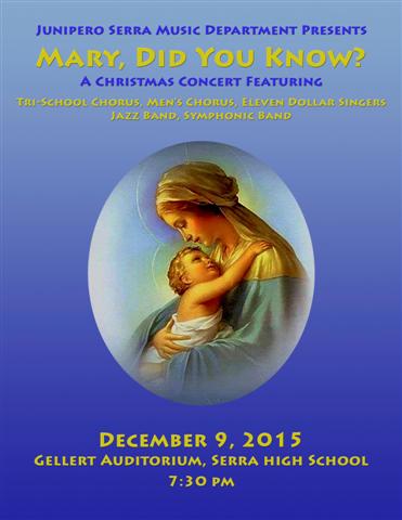 The Serra Music Department will present "Mary Did You Know?" a special Christmas concert for the entire Serra community tonight at 7:30 p.m. The concert will feature the Tri-School Chorus, Men's Chorus, Eleven Dollar Singers, Jazz Band, and Symphonic Band. "I'm especially proud of all the groups' progress this semester," said Serra Music Director Jay Jordan. "We have the biggest Men's Chorus in school history, with many freshmen and other new faces. With the most girls we've had since the '90s, the Tri-School Symphonic Band sounds very strong for this time of year, as does the Jazz Band. I'm really looking forward to the concert."