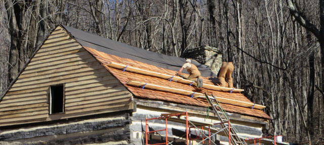 | Workers replace the shake roof of Polly Woods Ordinary in Virginia
