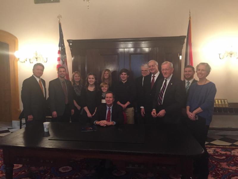 Sharing in the events of the day were Dr. Gordon Snider, friend of Representative Gerald Stebelton, and two cardiac arrest survivors, Mr. Rob Walker, Pickerington, and Ms. Claire Birkholz, Dublin. Mr. Walker lost his brother to sudden cardiac arrest while he was coaching football at Northwestern. Mr. Walker has cardiomyopathy and his AICD has provided therapy to convert life threatening rhythms. Ms. Birkholz, age 12, was accompanied by her mother Christy, older brother Will, and younger brother Reid. Ms. Birkholz experienced sudden cardiac arrest at the age of 9 as the result of undiagnosed long QT syndrome. While waiting for our bill to be signed, Representative Stebelton provided a personal tour of the House Chamber. That day was Representative Stebelton's last day in office due to term limits in the House. Our group was prepared to meet with Governor Kasich, and we were escorted into the ceremonial office. The Governor engaged us in conversation and asked why this bill was important to us. While the bill was important to us all, it was most important to Mr. Walker and Ms. Birkholz. Governor Kasich asked them to share their stories. As the stories were shared, tears flowed. The embrace of Governor Kasich and young Ms. Birkholz warmed every heart in the room. The Governor asked what else we needed to do, and ACC members provided a number of ideas. Governor Kasich proceeded to sign HB 247 into law as Mr. Reid Birkholz finalized it by applying the period after the initial R, John R. Kasich. It was an honor for ACC members to share this experience with the patients that we serve. We are committed not only to providing excellent healthcare, but advocating on their behalf.