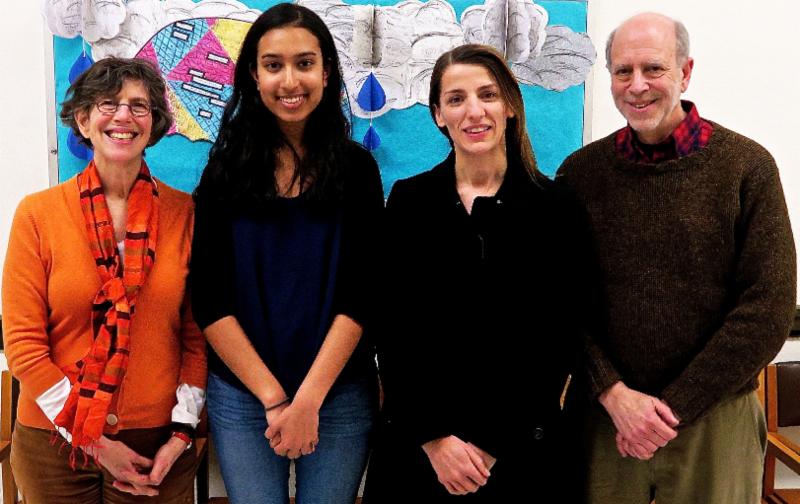 Left to right: Mary Ann "Twiggy" Lazarus ('68); grant recipient Sruti Ekkirala ('17); Uni Science teacher Sharlene Denos, and William "Billy" Lazarus ('66.) Richard ("Richy") Lazarus, '71, also attended the school visit by teleconference.