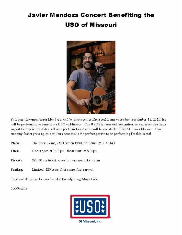 On September 18, 2015, Javier Mendoza will host a concert at The Focal Point at 8pm which will benefit the USO of Missouri. Tickets are on sale now