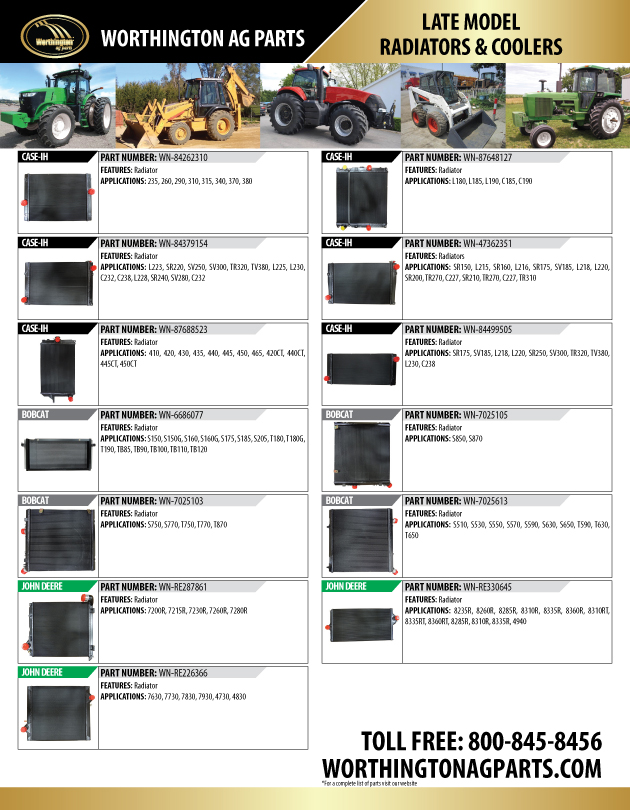 Are you looking for late model Radiators & Coolers for your Tractor, Combine or Skid Steer? Worthington Ag Parts has the parts you need.