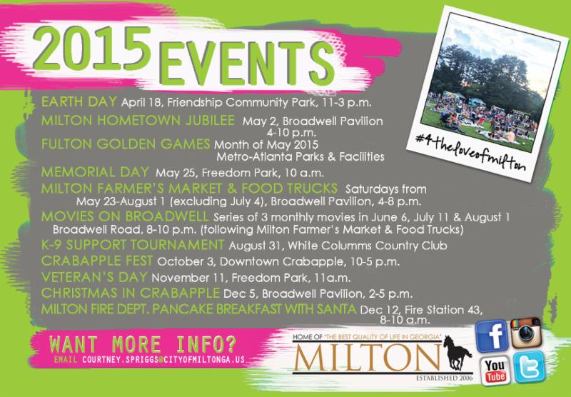 Mark your calendars for the first Milton Hometown Jubilee on Saturday, May 2 from 4 to 10 p.m. in downtown Crabapple on Broadwell Road in front of the new Broadwell Pavilion. Enjoy dishes and signature cocktails from local restaurants, local shopping and a Derby screening compliments of BankSouth.