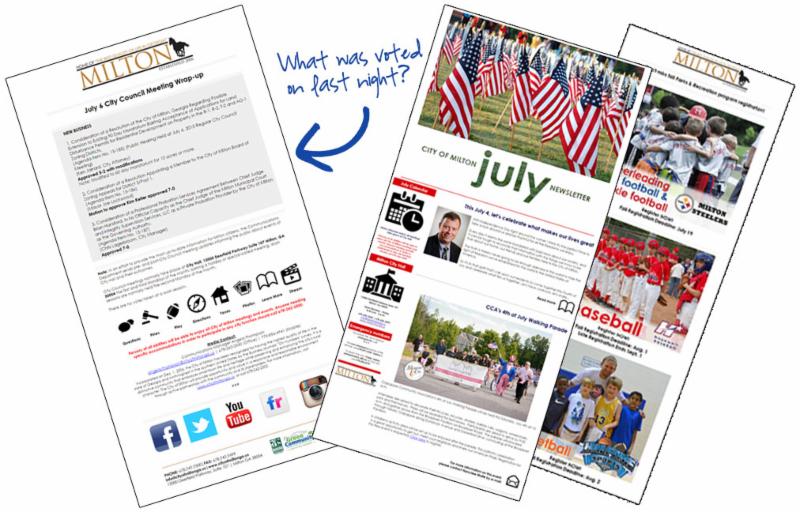 By signing up for the City of Milton's email newsletter, you not only receive the latest city news and recreation information - you also receive monthly updates tracking important zoning cases, weekly updates of City Council agendas and votes, and much, much more.