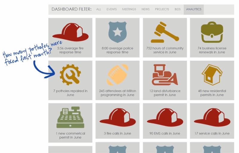 Thanks to the dashboard on the front page of Milton's web site, you can view nearly two dozen key success measures as identified by the city's StrategicPlan. While the stats are updated monthly, each is linked to a four-year analysis to show year over year trends. All data is also available for download. This dashboard holds more than analytical data, it also connects users easily to the full calendar of Milton's meetings and events, a robust road, plan and code project list updated regularly, and the city's advertisements of open bids.