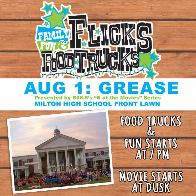 Bring a blanket or chair, kick back and have a great time at the final "Family, Fun, Flicks & Food Trucks" summer screening this Saturday night, Aug. 1, on the front lawn at Milton High School for a screening of Grease presented by B98.5's "B at the Movies" Series.