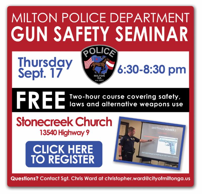Join Milton Police Department's Community Response Unit Thursday, Sept. 17, at 6:30 p.m. for a free Firearms Safety Seminar at Stonecreek Church, located at 13540 Hwy 9.